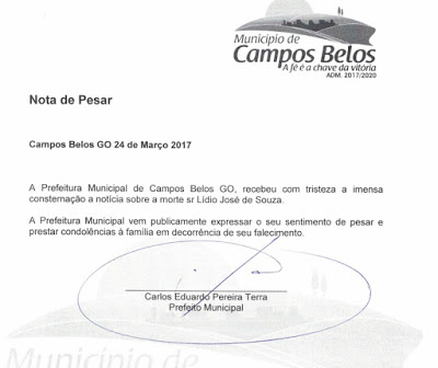 A prefeitura de Campos Belos emitiu Nota de Pesar pelo falecimento do servidor aposentado Lídio José de Souza, ocorrido nesta sexta-feira (24).