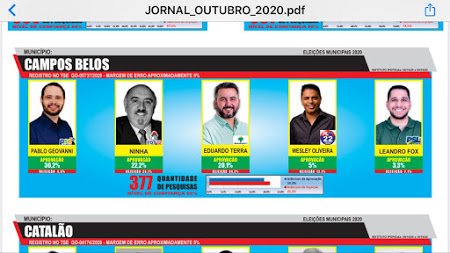 Uma pesquisa feita em 129 municípios do estado de Goiás e publicada no jornal impresso Cidade e Negócios, indica que os candidatos Pablo Geovanni e Juranda aumentam margem de intenção de votos a frente dos demais colocados na disputa pelo pleito municipal de Campos Belos.