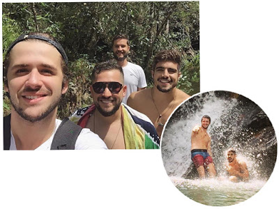Ao seu lado, o também ator Gil Coelho e o modelo Diego Giallanza, que se aventuram juntos em um roteiro cheio de cachoeiras e trilhas, com direito a pausa para sessão de fotos.