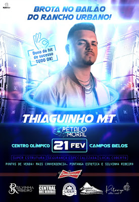 Sucesso nacional com o grande candidato ao hit do verão, a canção “Tudo OK”, o cantor Thiaguinho MT se apresenta no próximo dia 21 de fevereiro, em Campos Belos, no nordeste goiano.