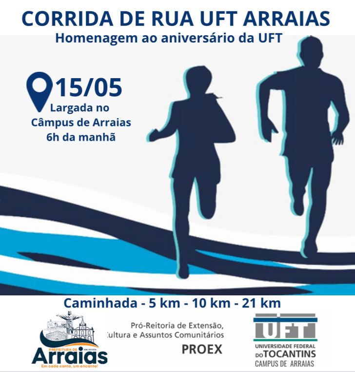 Em celebração aos 19 anos do Câmpus da UFT em Arraias, será realizada uma corrida de rua e caminhada no próxima dia 15 de maio, às 06h.