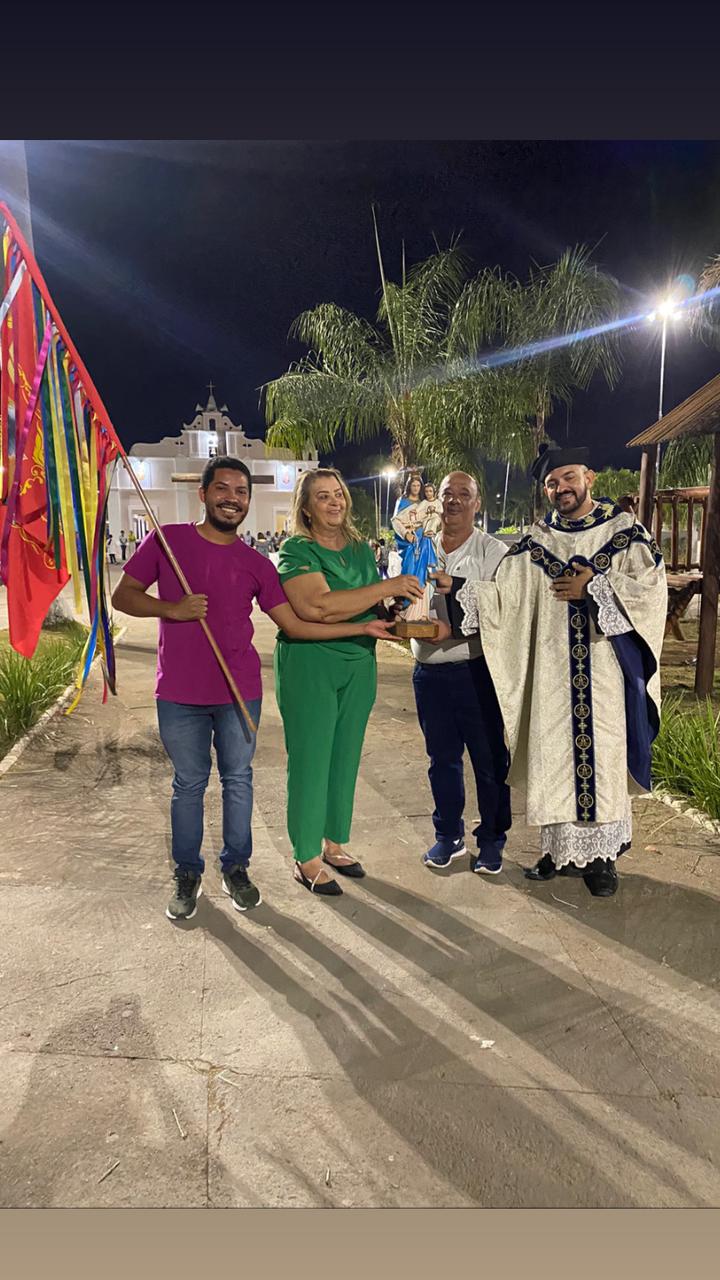 Por último, o rei Sebastião Murilo e a rainha Donizeth Pinheiro, acompanhados das damas e das pajens, se dirigiram até os tronos que estão dispostos em cima do palco, onde será celebrada a missa campal.