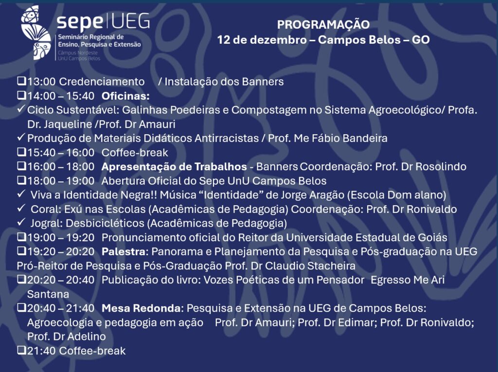 O Câmpus Nordeste da Universidade Estadual de Goiás (UEG), em Campos Belos, sediará no próximo 12 de dezembro de 2025 o Seminário Regional de Ensino, Pesquisa e Extensão (SEPE) — um dos mais importantes encontros acadêmicos da instituição.