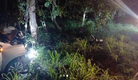 A colisão envolveu um carro de passeio e uma motocicleta. Com o impacto, o automóvel saiu da pista e bateu contra uma árvore. No carro estavam três pessoas, que não se feriram.